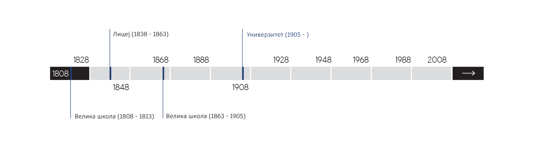 Развој Универзитета се може пратити од 1808. године. У временском развоју се издвајају периоди Велике школе (1808 – 1813), Лицеја (1838-1863), Велике школе (1863-1905) и Универзитета (1905-).